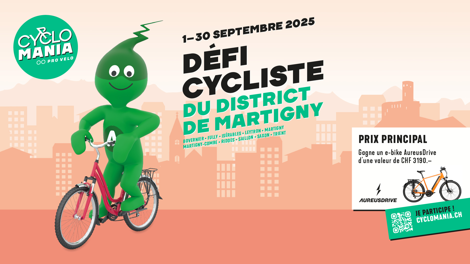 Durant le mois de septembre, la population du Chablais et de la Riviera est encouragée à saisir son vélo et pédaler un maximum de kilomètres pour remporter le titre de meilleur cycliste. Depuis 2020 sous l’égide de MyEnergie, les dix communes du District de Martigny s’allient au concours de Pro Vélo Suisse pour promouvoir une pratique du sport quotidienne favorable à l’environnement.