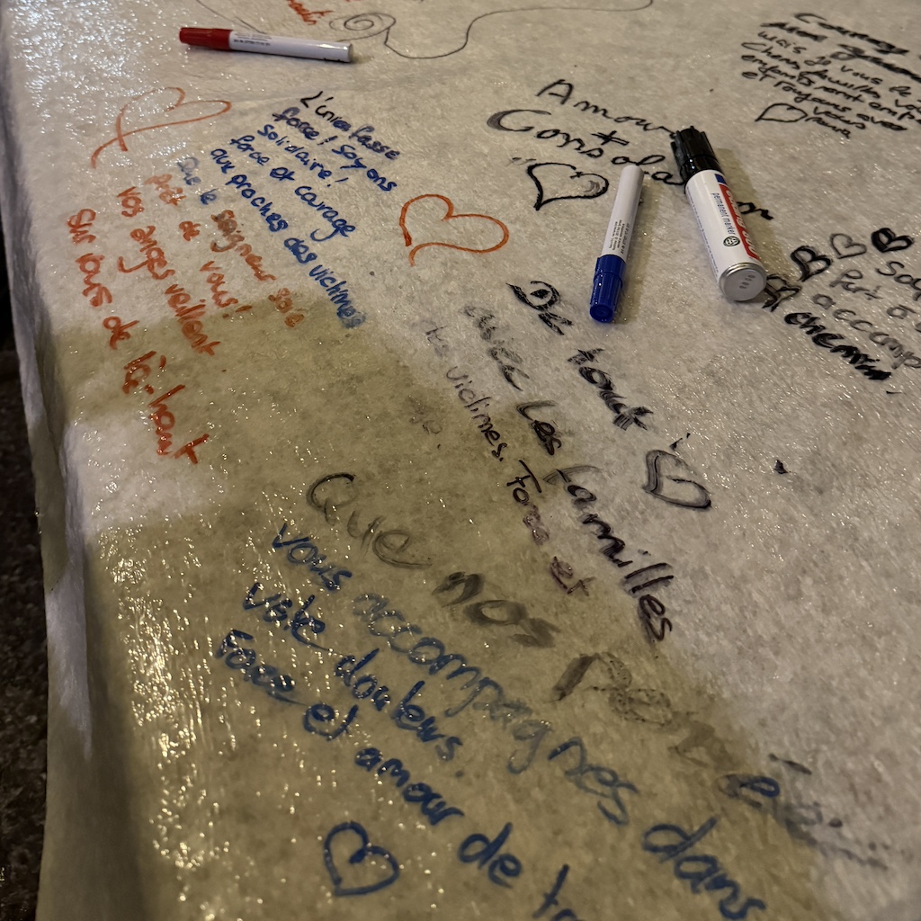 A l’issue de cette marche silencieuse, des stylos ont été mis à disposition des participants, leur permettant d’écrire quelques mots de soutien sur des banderoles. Celles-ci sont destinées aux victimes, et plus largement à toutes celles et ceux qui souffrent de ce drame. La soirée s’est achevée par un moment de recueillement, mettant un point final aux hommages.
