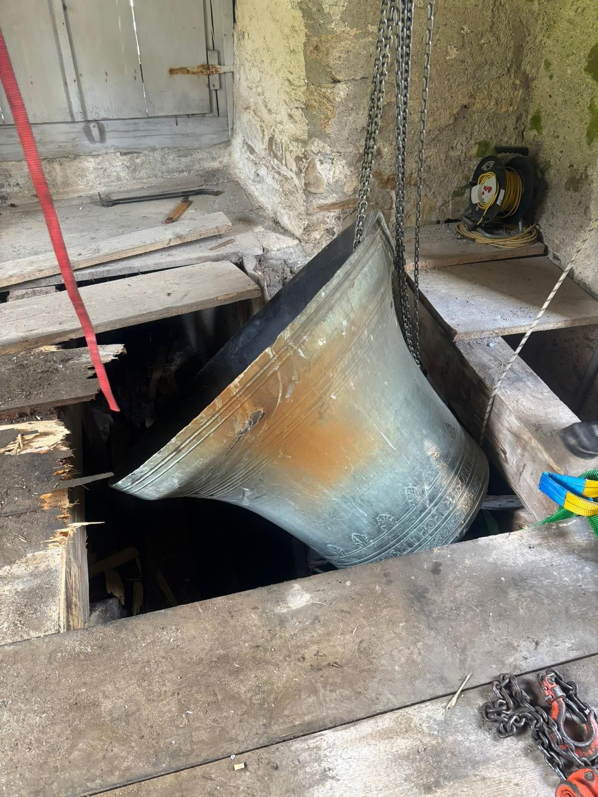 Plus de peur que de mal : la cloche de plus d'une tonne et demie ne porte aucune séquelle de sa chute.