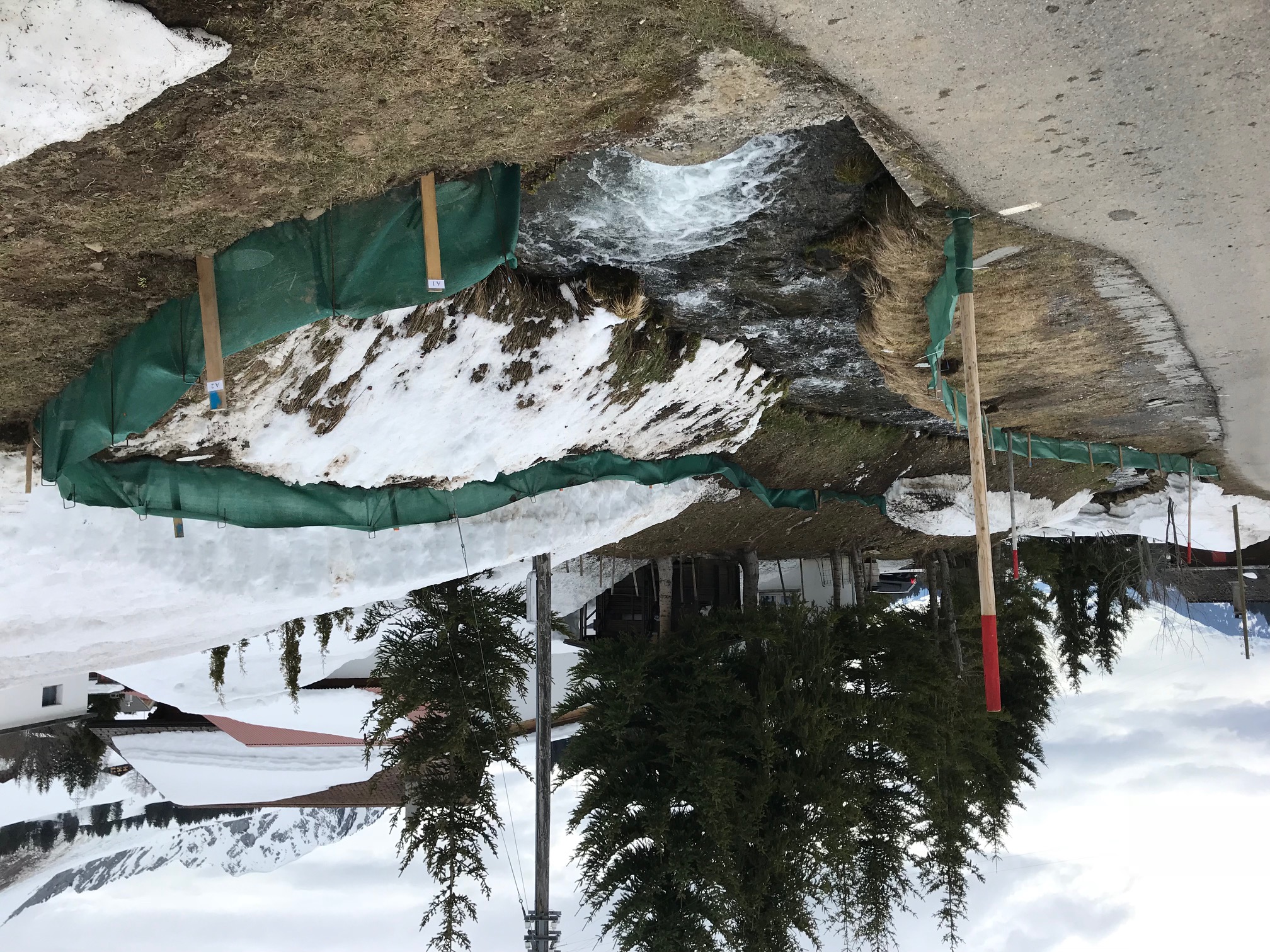 La barrière provisoire stoppe la lancée des grenouilles qui terminent dans un seau. Celles-ci sont déplacées en sécurité chaque matin. Crédit : Parc Naturel Régional Gruyère Pays-d’Enhaut