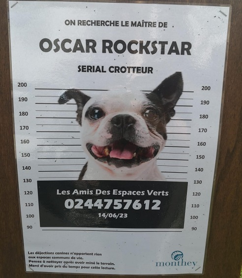 Placés en début d’été à la place du Comte-Vert et au Vieux-Pont, plusieurs affichages ont pu vous faire sourire. Et pour cause : ils reprennent l’apparence d’un avis de recherche, sur lequel on peut voir un chien en coupable tout trouvé, qui porte une pancarte sur laquelle est écrit « Serial Crotteur ».