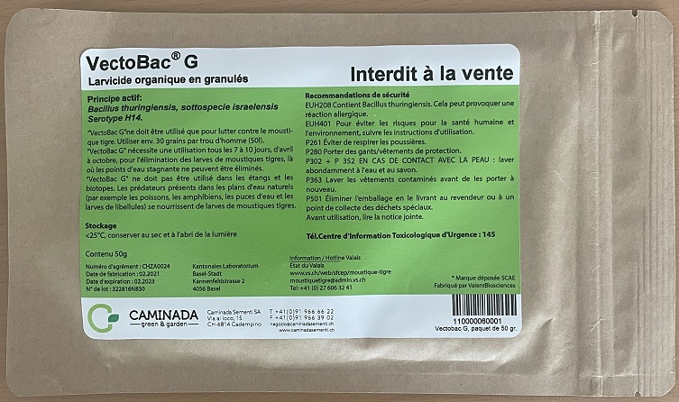 Rassurez-vous, ce risque est très limité d’après les autorités. Il n’en demeure pas moins que le moustique tigre gagne du terrain dans le Chablais, où il a été détecté pour la 1ère fois en 2019. A Monthey, des mesures sont prises sur le domaine public et depuis 2021, les privés ont été inclus. Via des tout-ménages, des instructions leur ont été fournies : gestes à adopter, eau à vider et utilisation du VectoBacG (photo), un produit capable d’éliminer les larves, distribué gratuitement par la commune.