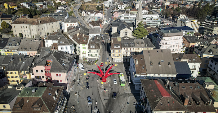 Le triboulet géant sur la place centrale. Clou de l'opération "décoration" et aussi de l'identité carnavalesque montheysanne, le bonhomme rouget aux grelots jaunes y trônera jusqu'au mercredi des Cendres.