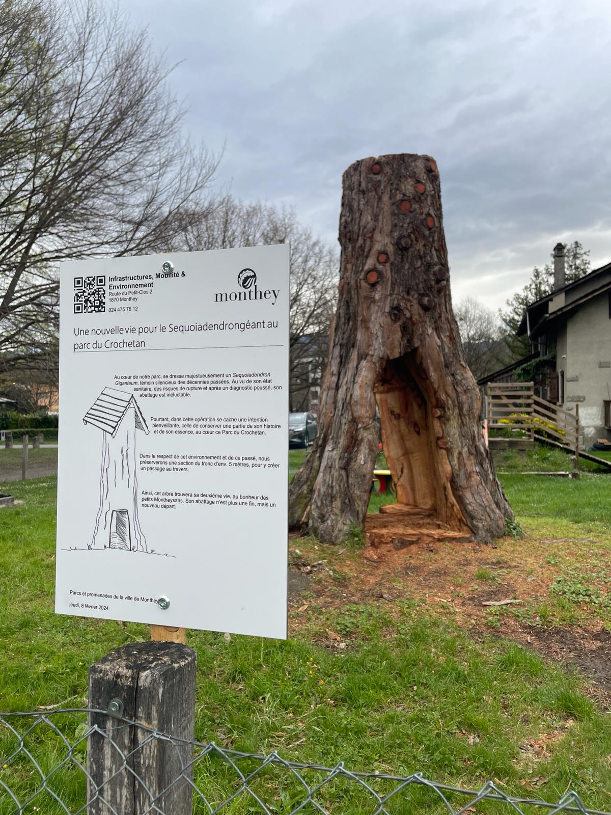 Ce séquoiadendrongéant, situé dans l'aire de jeux d’une garderie de Monthey au coeur du Parc du Crochetan, a dû être abattu pour des raisons sanitaires. En mauvaise santé, ses branches présentaient des risques de rupture.